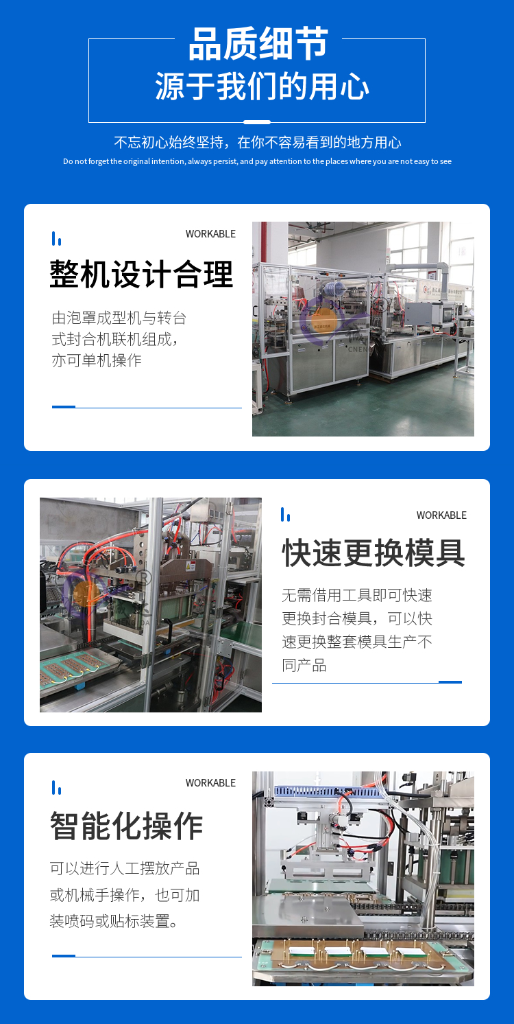可以实现泡罩-挂卡,以及挂卡-泡罩-挂卡的包装形式,只需再增加一台泡罩成型机即可实现双面泡罩封合包装。封合区域预留3-4个工位,可以进行人工摆放产品或机械手操作,也可加装喷码或贴标装置。